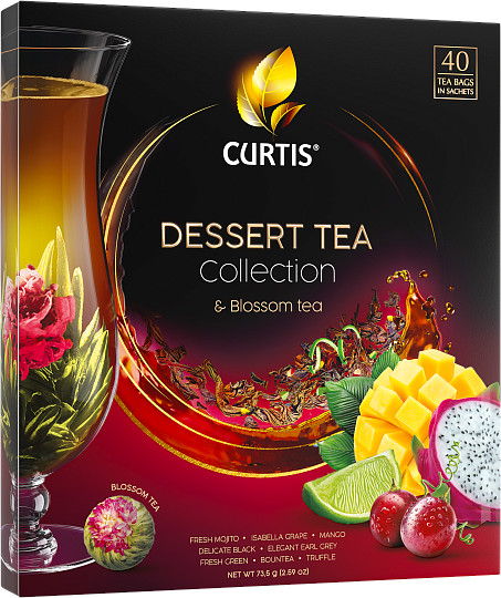 Curtis Desszert Tea Kollekció és Blossom Tea - 8 féle fekete, zöld és fehér aromás tea kollekciója speciálisan csomagolt teafilterekben, valamint egy virág alakú tea pokone dobozban. Csodálatos Curtis teakeverékek, gyümölcsdarabok és virágszirmok váratlan kombinációi, amelyek vízzel leöntve felfedik ízüket és illatukat, így kifinomult ízek és aromák széles skáláját kínálják. Egy csésze Curtis tea elfogyasztása az egyedüllét és álmodozás pillanatainak öröme. A Curtis arra ösztönöz, hogy képzeletedet valóra váltsd. Összetevők: Isabella Grape - Fekete tea, szőlő aroma, rózsaszirmok Fresh Mojito - Zöld tea, lime és menta aroma, citrushéj, menta, citromfű Mango - Zöld tea, almadarabok, mangó aroma, rózsaszirmok Bountea - Fehér tea, pitaya aroma, almadarabok, rózsaszirmok, savanyúságot szabályozó anyag - citromsav Delicate Black - Fekete tea Fresh Green - Zöld tea Elegant Earl Gray - Fekete tea, bergamott aroma, citrushéj Truffle - Fekete tea, szemcseszerű darabok, csokoládé szarvasgomba aroma Blossom Tea - Zöld tea Kiszerelés: Nettó tömeg: 73,5 g, 40 teafilter plusz virág alakú tea, kartondoboz Tea elkészítése: Öntsön forrásban lévő vizet egy fekete teafilterre, és 85 fokos vizet egy zöld teafilterre, és hagyja állni 3-5 percig.