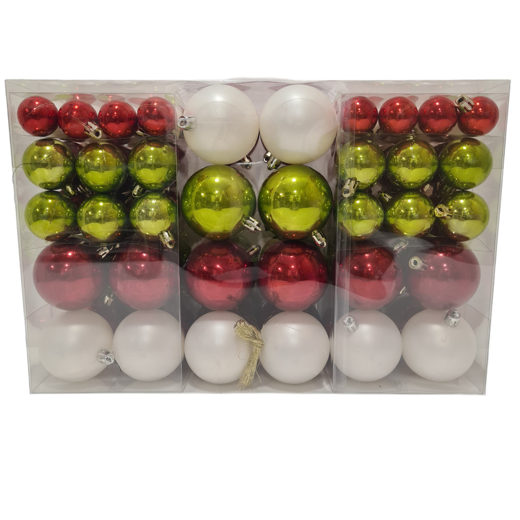 Gömb dobozban műanyag fehér, zöld, piros 3cm, 4cm, 6cm S/100