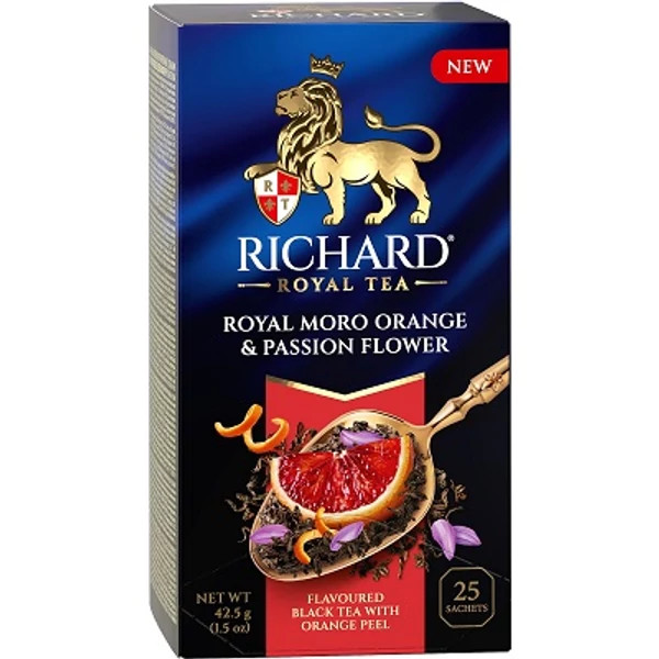 Royal Moro Orange & Passion Flower- Fekete tea narancshéjjal és golgotavirág aromával. Csodálatos illatú fekete tea a lédús Moro narancs ízével és a golgotavirág finom aromájával.